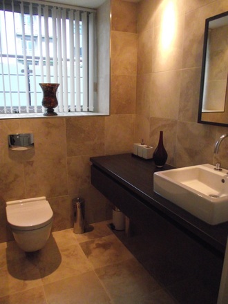 Stylish bathroom with tiled walls and flooring, shower over the bath, WC and sink with vanity draws.